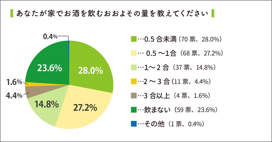 1合以下が約半数。中には「3合以上」(1.6%)というツワモノも。「産後、昔ほどはお酒が飲めなくなった」とはよく聞く話ですが、皆それぞれのペースでお酒を楽しんでいるようです。