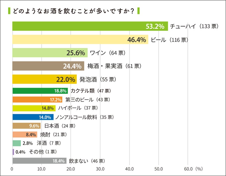 ・人気のお酒は、「チューハイ」(53.2%)、「ビール」(46.4%)、「ワイン」(25.6%)が並ぶ。