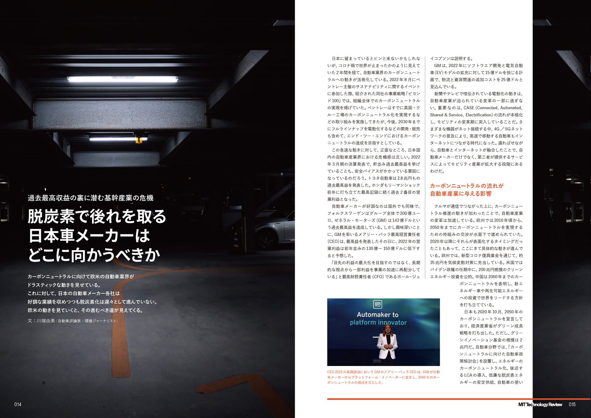 投資が急拡大している「気候テック」の分野からは、クリーンエネルギー、ペットボトルリサイクル、地熱発電、バイオ油など、世界最先端のエマージング・テクノロジー企業を一挙紹介。日本の基幹産業である自動車メーカーの脱炭素戦略を、ジャーナリストの川端由美氏が解説します。さらに国や企業がGX、イノベーションに取り組む際の姿勢について、国連の専門家組織のメンバーである田中加奈子氏、エネルギーアナリストの大場紀章氏の提言を掲載します。