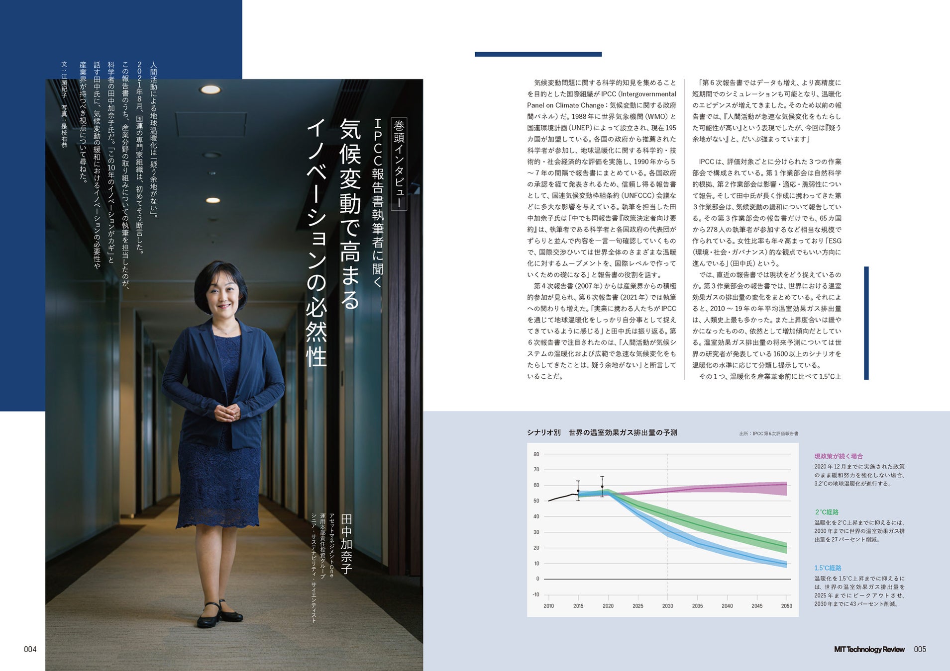 2021年8月、国連の専門家組織は報告書で初めて、人間活動による地球温暖化は「疑う余地がない」と断言しました。この報告書の執筆に日本から参加した1人が、アセットマネジメントOneに所属する田中加奈子氏です。「この10年のイノベーションがカギ」と話す田中氏に、気候変動対策におけるイノベーションの必要性、産業界が持つべき視点について伺いしました。