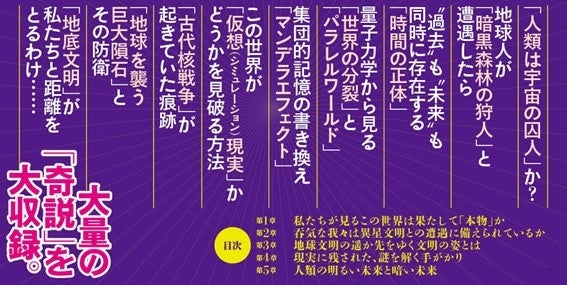 量子力学、時間、世界、宇宙といったサイエンスからはじまり、果てには生命や世界の創造主、「アポロ計画」と月の正体、未来を占う「Universe25実験」まで、好奇心をくすぐる大量の奇説を収録しています。