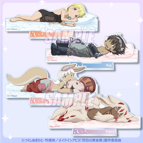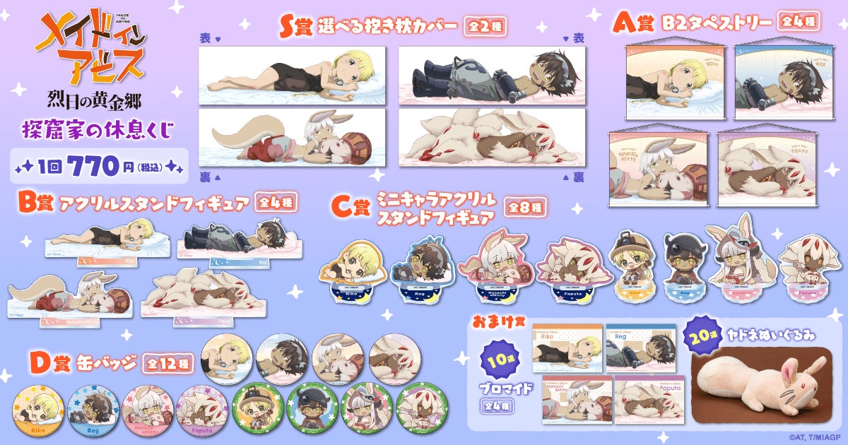 商品は、「探窟家の休息」がテーマの新規描き下ろしイラストによるオリジナルグッズです。リコ、レグ、ナナチ&ミーティ、ファプタと添い寝しているような気分が味わえる抱き枕カバーやタペストリー、机などに飾って楽しめるアクリルスタンドフィギュアなど、ファン必携のアイテムが盛りだくさんです。また期間中、10連セット購入で「ブロマイド」、20連セット購入で「ヤドネぬいぐるみ」が貰えるキャンペーンも開催!