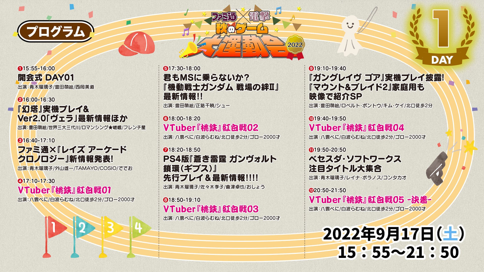 多くのゲームメーカーが参加し、この秋注目タイトルの最新情報発表のほか、「運動会」らしく、VTuberやファミ通・電撃スタッフによる紅白戦など、ゲームファン必見のバラエティに富んだ番組をお届けします。