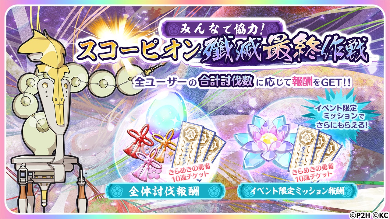 全ユーザーでスコーピオンを討伐し、「きらめきの勇者10連チケット」や「縁の輝石」を手に入れましょう!