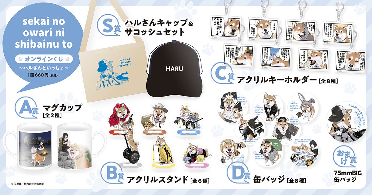 商品は、「世界の終わりに柴犬と」作者・石原雄先生の描く柴犬ハルさんの魅力的なイラストの数々や、現在YouTubeで配信中のアニメ(漫画動画)のアイキャッチなどを使用したオリジナルグッズとなります。また期間中に“リツイートキャンペーン”として、くじ引き堂のTwitter公式アカウントをフォロー&リツイートすると、抽選で3名様に「D賞 57mm缶バッジ全8種セット」をプレゼントいたします。この機会をお見逃しなく!