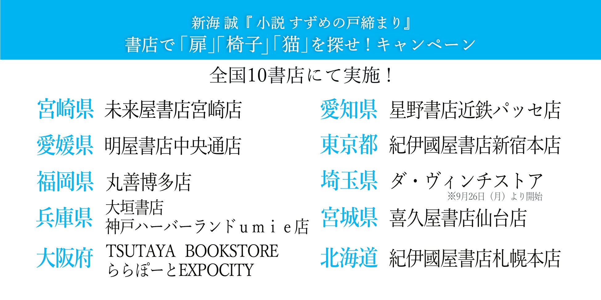 「扉」が出現する10店舗を、「すずめの椅子」が行脚する『「すずめの椅子」全国書店キャラバン』も開始! 最初の訪問地は【宮崎県】未来屋書店宮崎店、【愛媛県】明屋書店中央通店。その後、「椅子」はどこを巡っていくのか……? 行脚の様子は角川文庫編集部Twitterアカウント(@KadokawaBunko)にてお知らせ! 作中さながらに全国各地を駆け巡る「すずめの椅子」の旅を見守ってください。