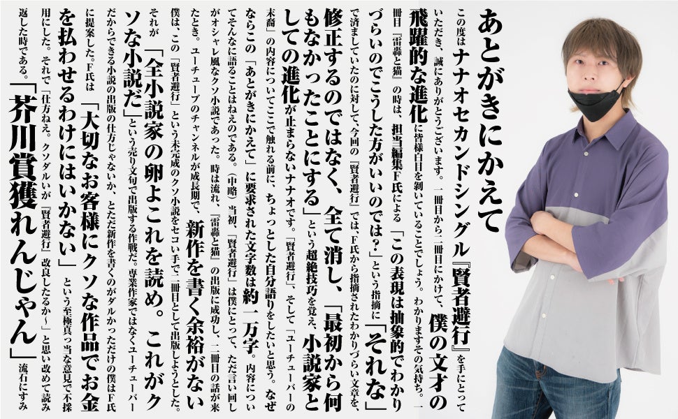 本作は、政治家を父親に持ちプレッシャーとコンプレックスを抱える男子高校生と、賢者を名乗る謎の男との邂逅(かいこう)と戦いを描く表題作「賢者避行」、父親がオワコンユーチューバーである中学生が主人公の短編「ユーチューバーの末裔」を収録しており、「ユーチューバーの末裔」はYouTuberだからこそ書ける衝撃作。『雷轟と猫』につづき、本作もSNSを中心に話題となり、予約時点でネット書店の人気度ランキング1位を獲得しています。(2022年8月5日時点)
