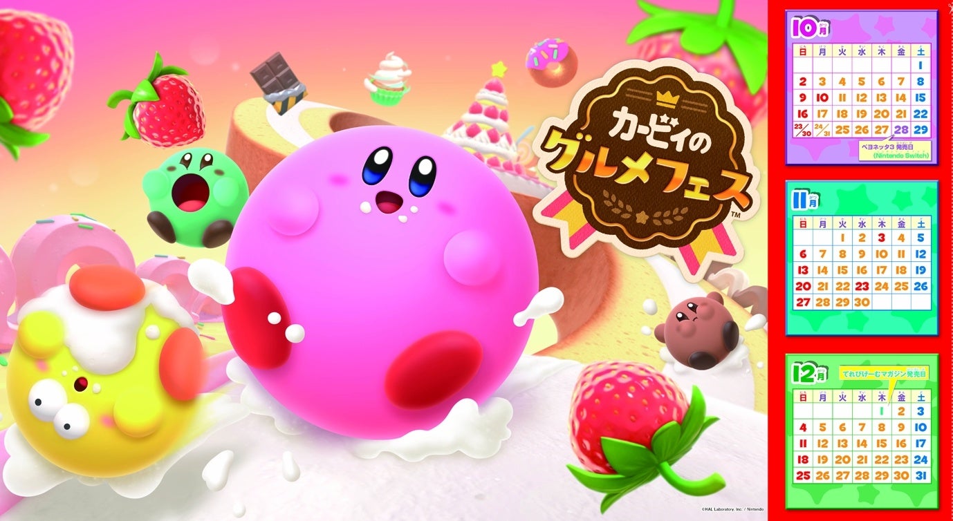 両面ポスター付録は片面が『カービィのグルメフェス』のポスターカレンダー(10月11月12月)。もう片面は『スプラトゥーン3』のスペシャルポスターになっています。