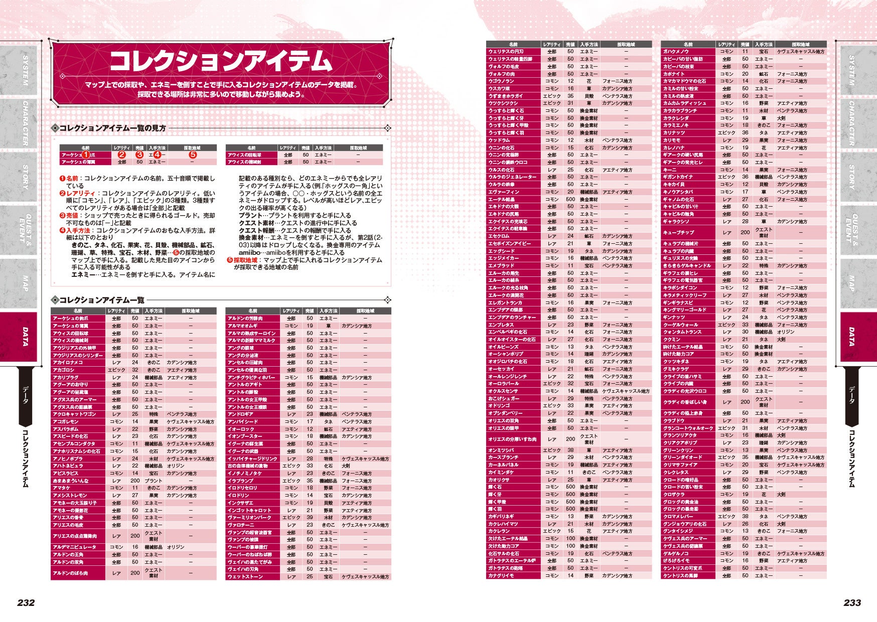 アイテムと装備品、料理に貴重品、ユニークモンスターやボスも含めたエネミーの情報など、各種データを網羅!