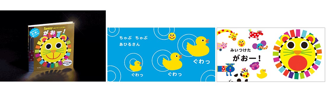 Sassyならではの「左右対称の顔」「はっきりした色や模様」に加え、「がおー!」「ぱおーん」「ぐわっぐわっ」というたっぷりの「なきごえオノマトペ」に、赤ちゃんが大喜び。