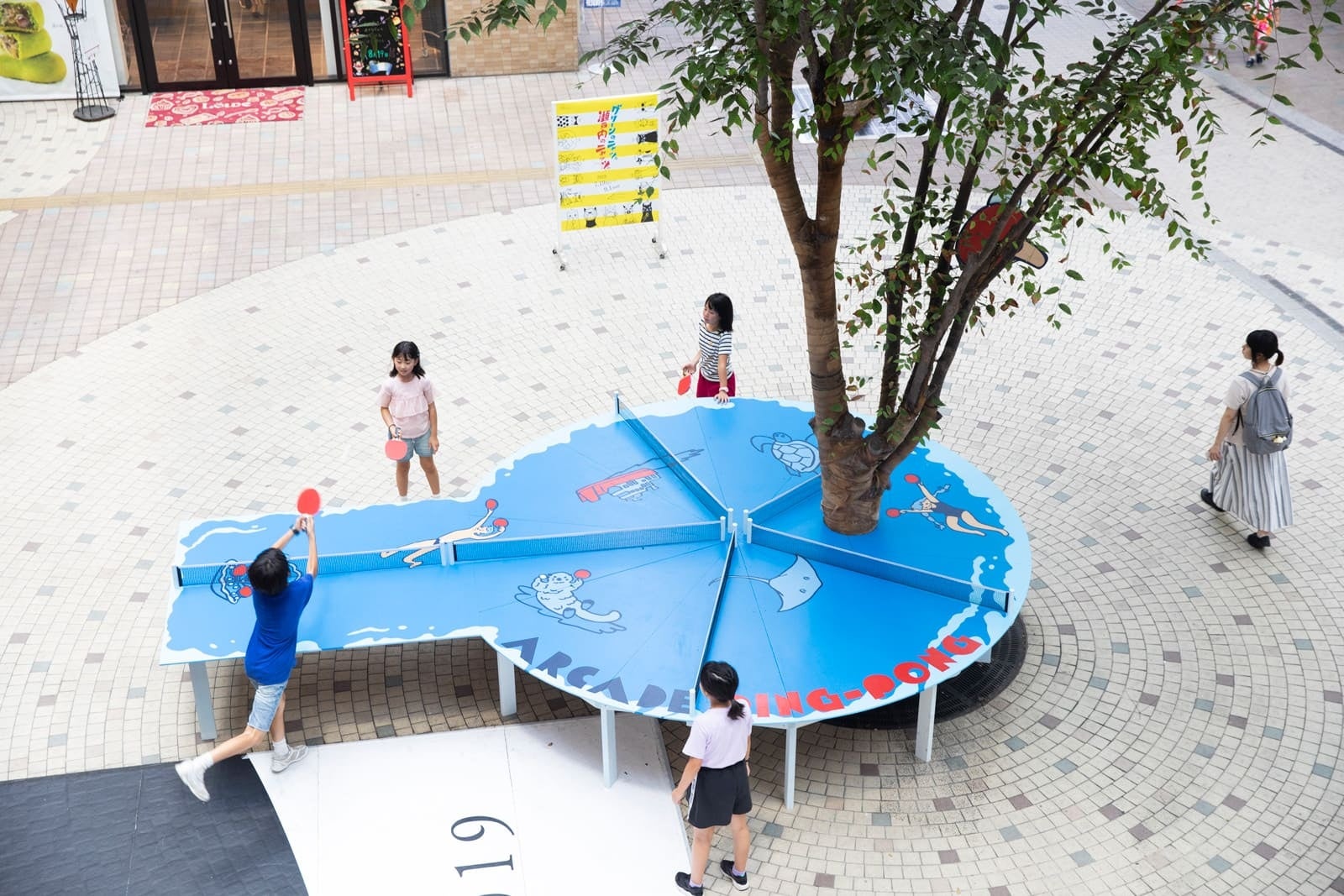 現代アーティストの原倫太郎+原游による、天板に「武蔵野」をイメージしたイラストが描かれた卓球台が登場。4人で円盤を囲み、回転しながらプレイする「武蔵野回転卓球」、球が天板にあたる度に木琴のような音が鳴る「ミニマリンバピンポン」、お子様でも楽しめる高さの「武蔵野3人卓球」と、どれもユニークな仕様で、家族や友達、時には見知らぬ人同士が話しながら、そして笑いながら身体でコミュニケーションをとることができるアート作品です。