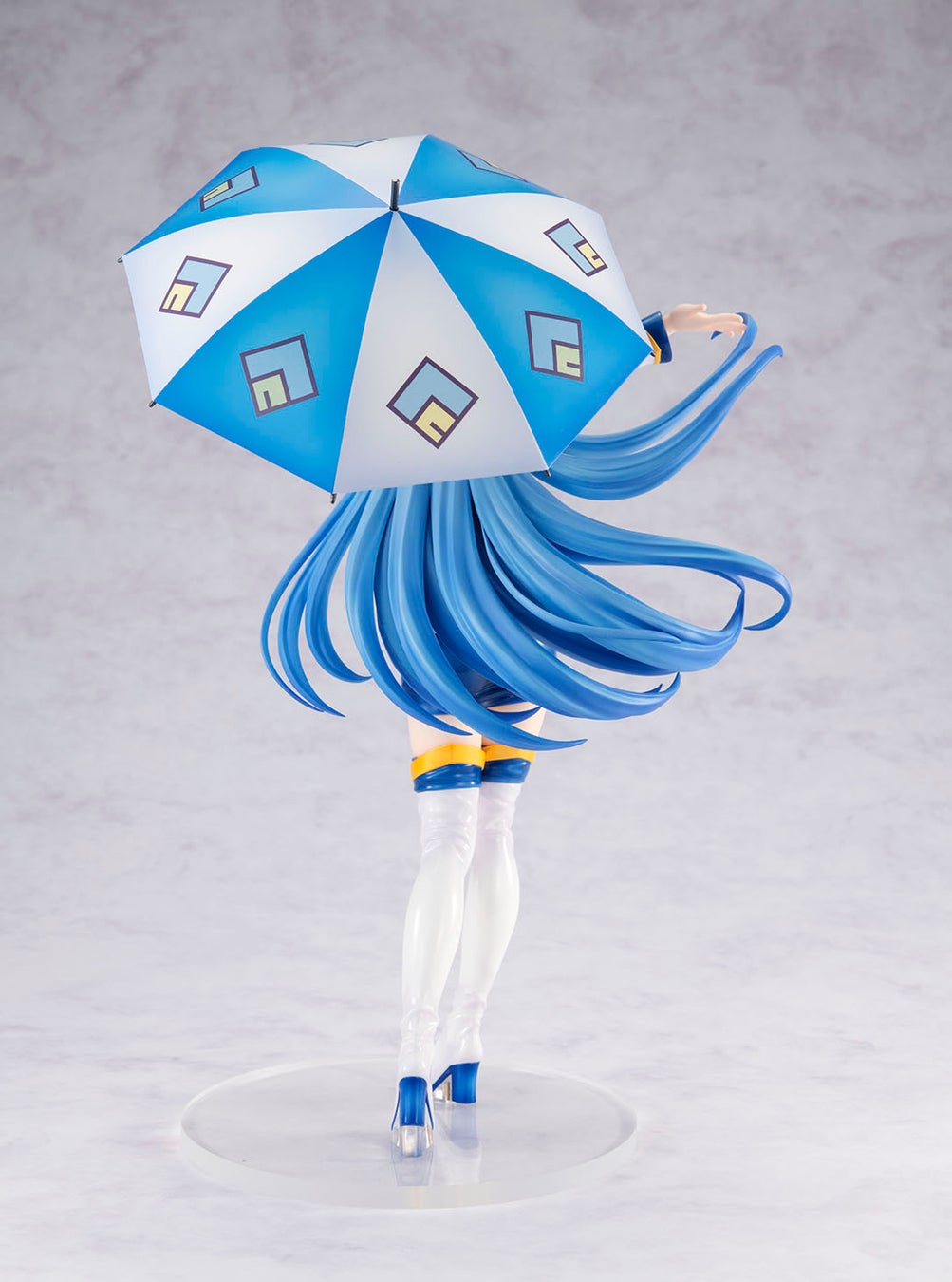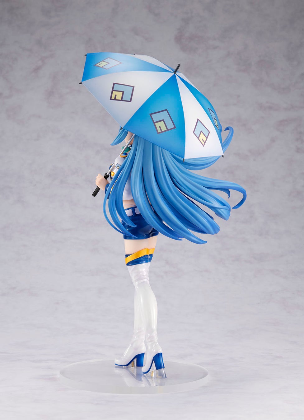 青と白をベースにしたコスチュームは、ツヤ塗装でエナメルの素材感を表現。大きなパラソルにはアクシズ教のマークがデザインされています。美しく広がる髪、元気いっぱいのポージング、キュートなウインクがたまらない表情など、アクアの魅力をめいっぱい詰め込みました!