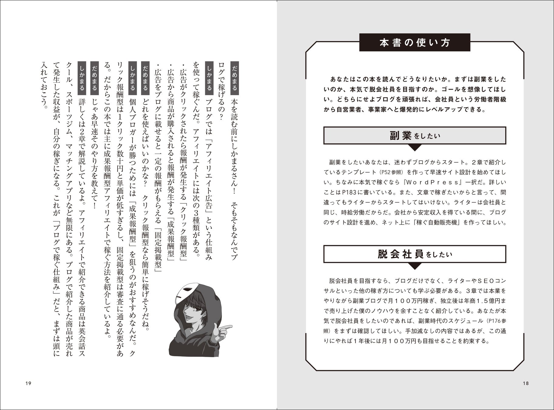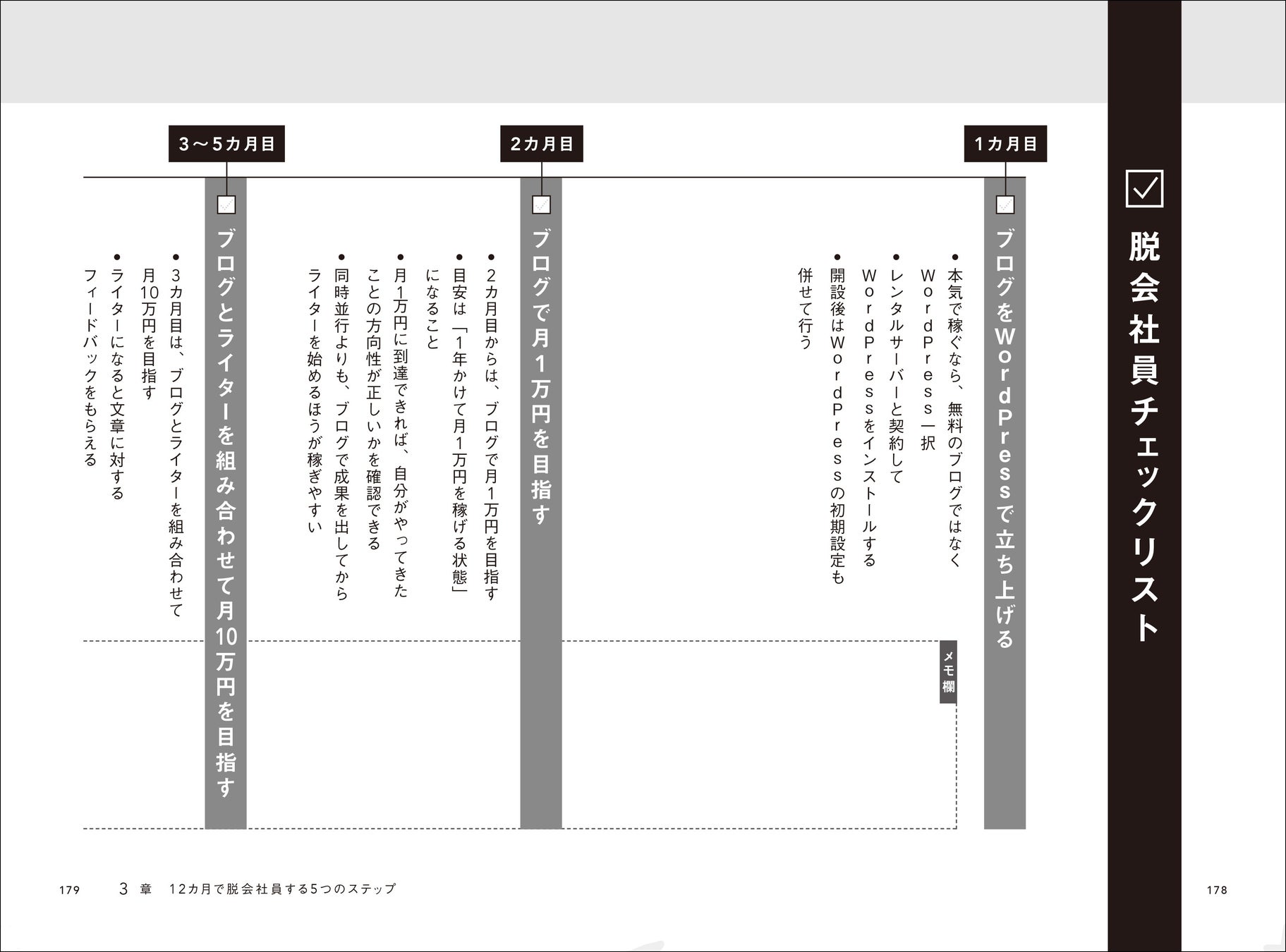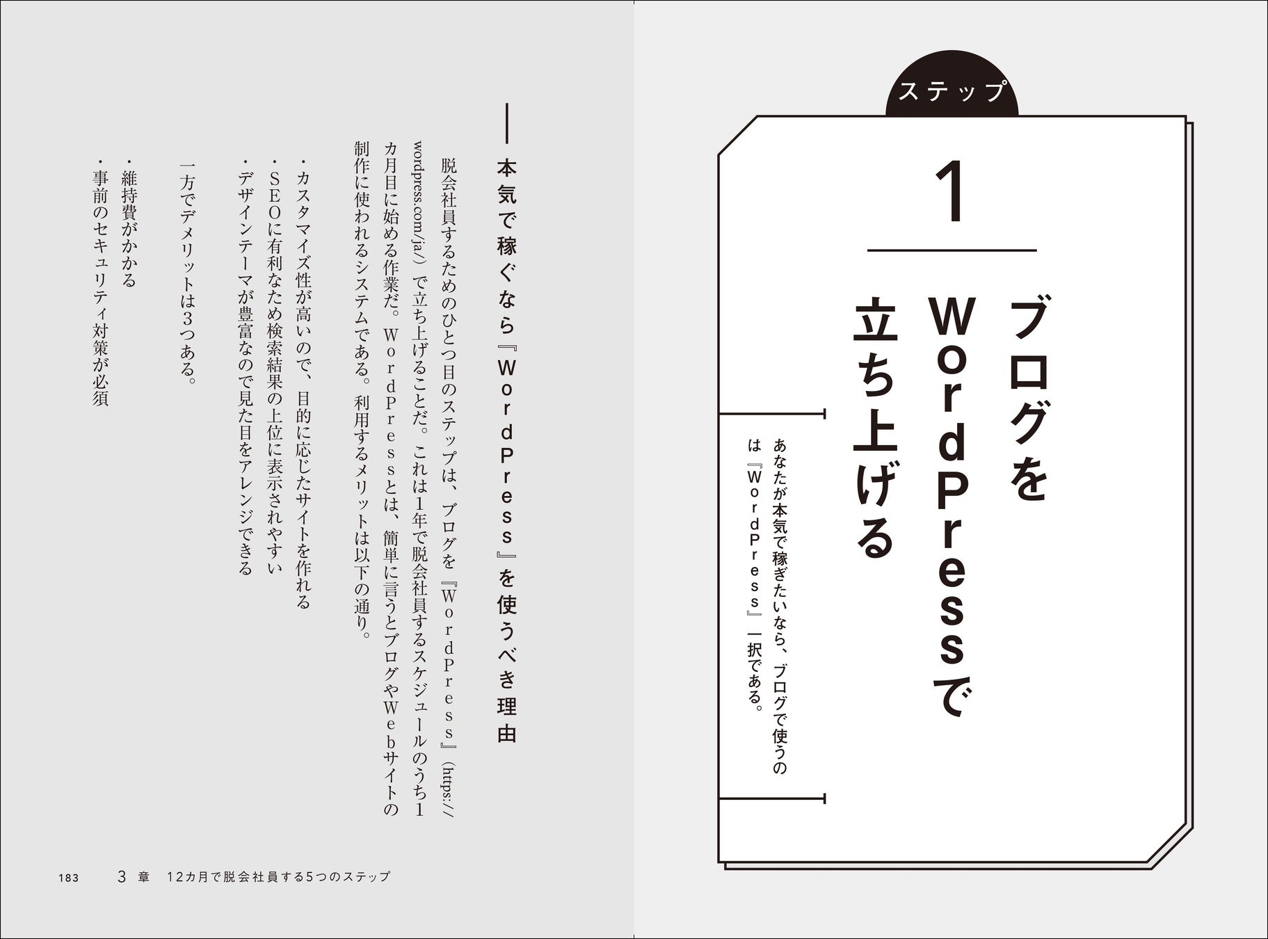本書はそんな「ブログの作り方」に加え、「ブログで学んだスキルをお金に変える」ことで、会社員以上の給与を稼げる方法を「12ヶ月で脱会社員する5ステップ」として公開。