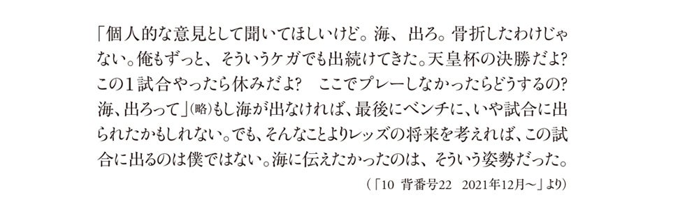プロ選手としてのキャリアを終えた今、自分が思うこと、ピッチで学んだこと、これからの選手たちに残したいこと、つなげていきたいこと、それを一つの本にまとめることができました。多く人に読んでもらえたら嬉しいです。