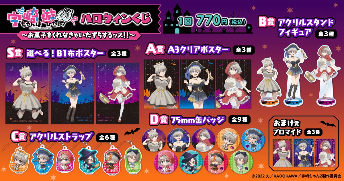 商品は、宇崎花の新規描きおろしイラストを使用したオリジナルグッズがラインアップ。さらにハロウィン衣装姿の亜細亜実、宇崎柳、宇崎月のミニキャライラストも登場し、ぜひ集めて飾りたくなるグッズを多数展開しております!
