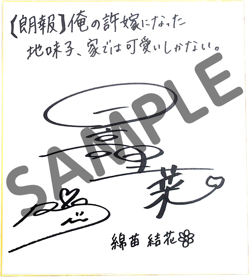 対象期間中に『【朗報】俺の許嫁になった地味子、家では可愛いしかない。ASMRボイスドラマ ~おはようからおやすみまで、許嫁は可愛いしかない~』をご購入いただき、プラットフォーム内のプレゼントキャンペーンページにてエントリーされたお客様の中から、抽選で1名様に「綿苗結花役 日高里菜さんの直筆サイン色紙」をプレゼントいたします。