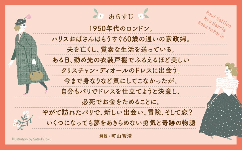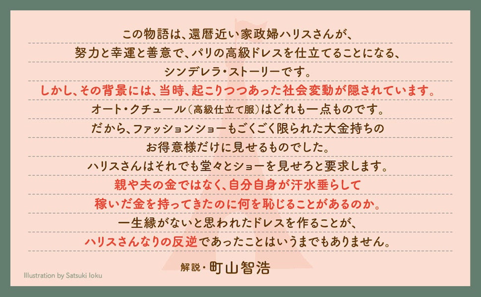 1950年代のロンドン。ハリスおばさんはもうすぐ60歳の通いの家政婦。夫を亡くし、質素な生活を送っている。ある日、勤め先の衣装戸棚でふるえるほど美しいクリスチャン・ディオールのドレスに出会う。今まで身なりなど気にしてこなかったが、自分もパリでドレスを仕立てようと決意し、必死でお金をためることに。やがて訪れたパリで、新しい出会い、冒険、そして恋? 何歳になっても夢をあきらめない勇気と奇跡の物語。解説・町山智浩