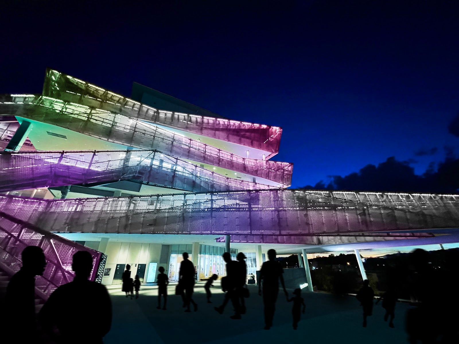 本棟外装(エキスパンドメタル)のライトアップ。サーカスのシャボン玉が空に舞い上がる様子をイメージしたカラフルな照明が、見る人の視線を大地から空へといざなう。