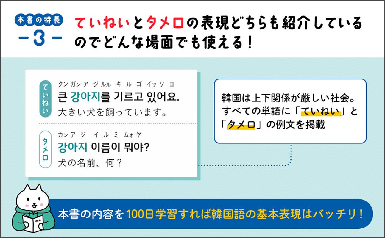 本書ではすべての単語に「ていねい」と「タメ口」の例文が掲載されているので、初対面や旅行先のフォーマルな場面でも、同い年や年下の人と話すカジュアルな場面でも使用できる表現をそのまま身につけることができます。