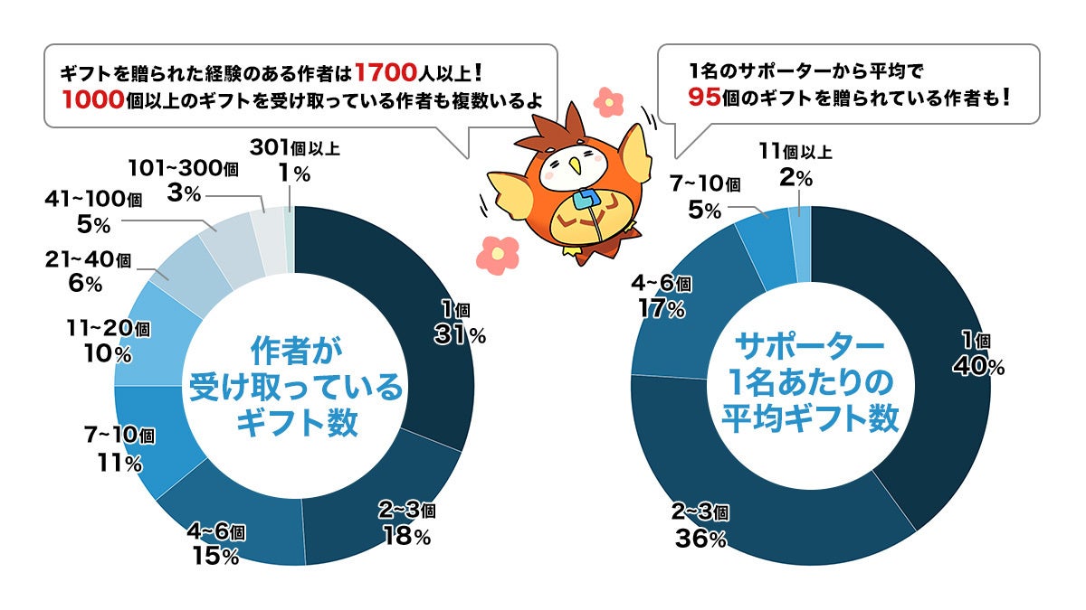 ギフトを贈られた経験のある作者は1700人以上、1000個以上のギフトを受け取っている作者も複数います。また、