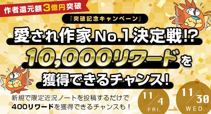 作者還元額3億円突破記念キャンペーンを実施中! 1万リワードを獲得できるチャンス!