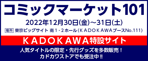 KADOKAWAの公式オンラインショップ カドカワストアでは、ブースで販売する商品の先行受注を開始致しました。商品情報は順次追加になりますので、カドカワストア内C101特設ページをご確認ください。また、C101商品を対象とした送料無料キャンペーンも実施しているので、この機会をお見逃しなく!