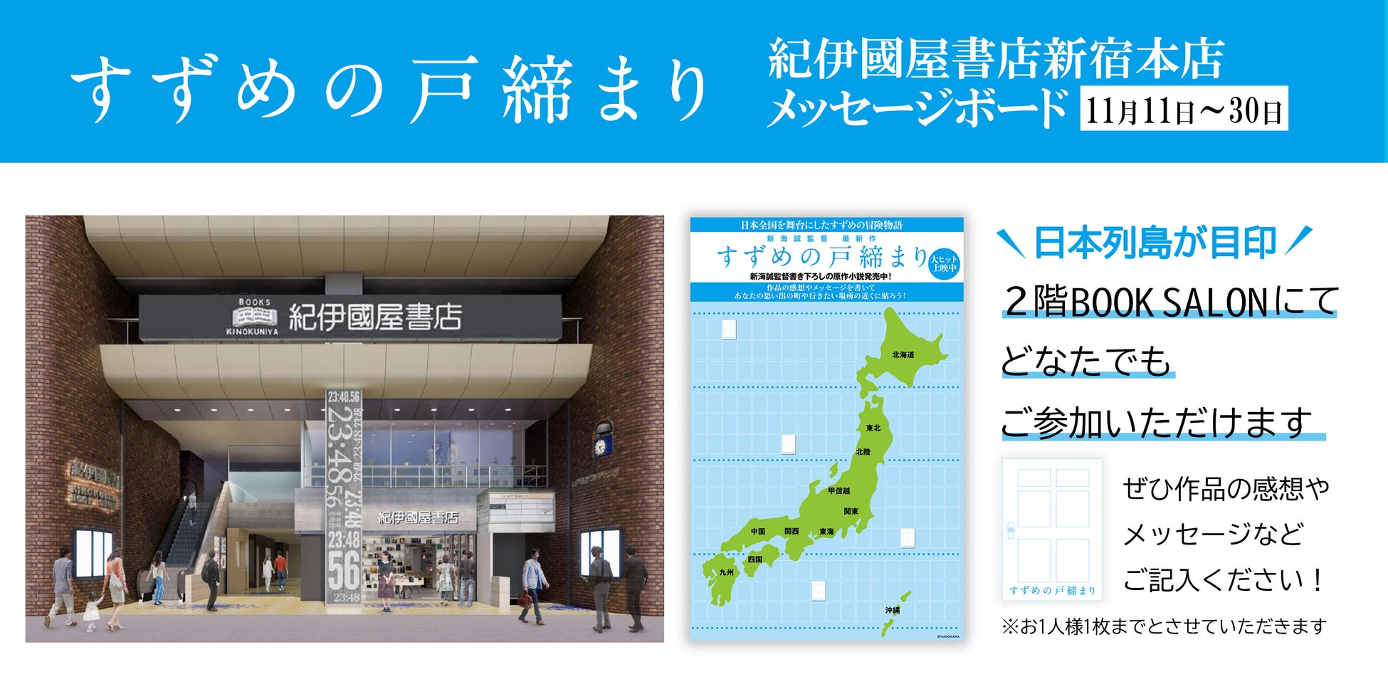 映画公開日である11月11日(金)より、「すずめの椅子」も展示中の紀伊國屋書店新宿本店に『すずめの戸締まり』メッセージボードが登場! 日本各地を舞台にした本作の物語にちなみ“日本列島”が目印となるボードに、ぜひ作品の感想やメッセージを書きこみ、あなたの思い出の町や行きたい場所の近くに貼ってください。