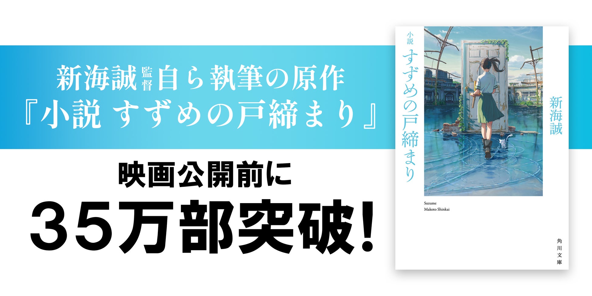 11月11日(金)の公開を控える、全世界待望の新海誠監督最新作の長編アニメーション映画『すずめの戸締まり』。公開に先駆けて、8月24日に刊行された新海監督書き下ろしの原作『小説 すずめの戸締まり』(角川文庫)が、映画公開を目前に累計発行部数35万部を突破しました!