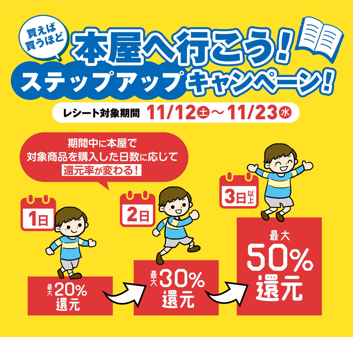 2022年11月12日(土)~11月23日(水)の期間中、書店で対象商品を購入した日数に応じて、購入金額の最大50%分の図書カードNEXTネットギフトをプレゼントします。