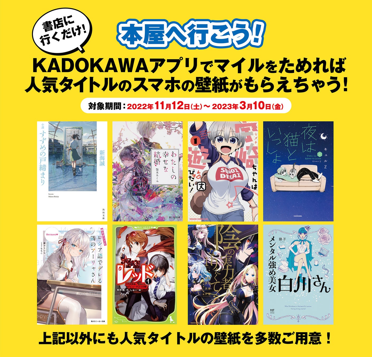 書店店頭でKADOKAWAアプリを使ってマイルを獲得し、人気タイトルのスマホ壁紙と交換できます。
