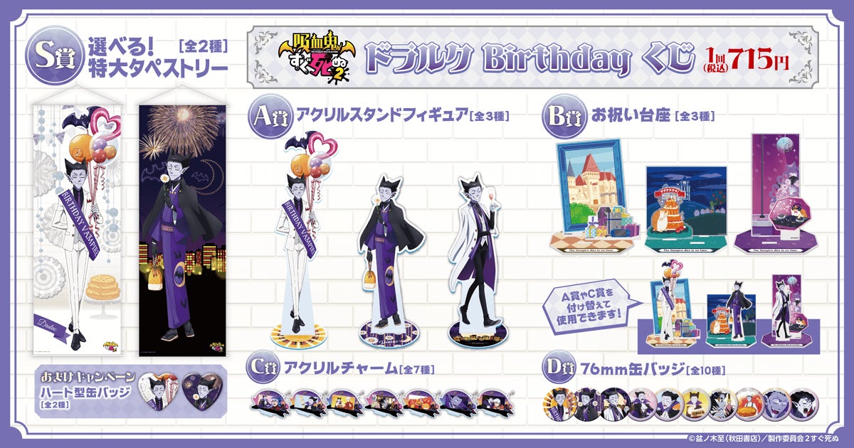 商品は、ドラルクの誕生日を記念した新規描き下ろしイラストによるオリジナルグッズとなります。ドラルクの新たな魅力を描いた描きおろしイラストの商品や、作中の思い出のシーンを集めた商品など、ドラルクの魅力を詰め込んだ商品と共に、ぜひドラルクの誕生日を祝いましょう! また期間中に“リツイートキャンペーン”として、くじ引き堂のTwitter公式アカウントをフォロー&リツイートすると、抽選で3名様に「D賞 76mm缶バッジ描き下ろし2種セット」をプレゼント!! この機会をお見逃しなく!!
