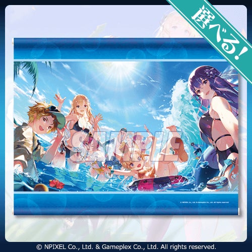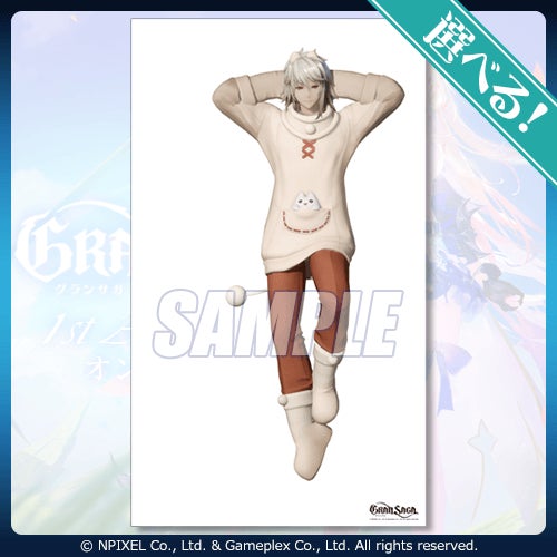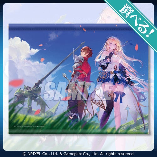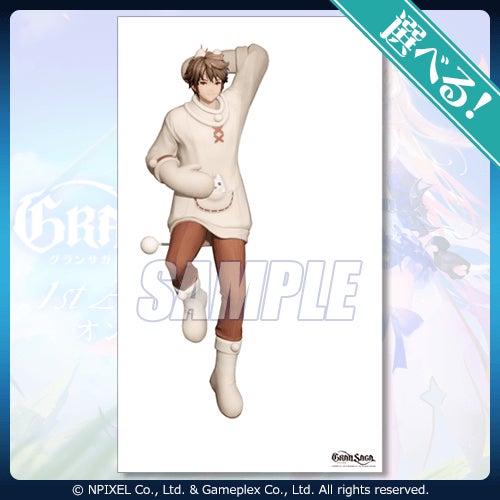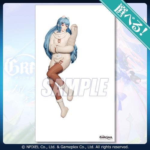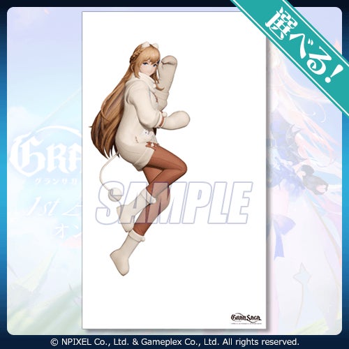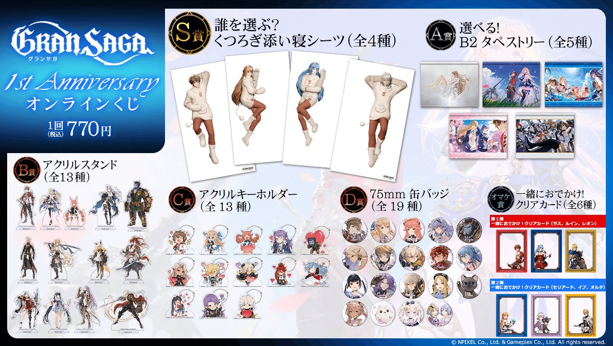 くじの商品には、ここだけのビジュアルを用いた添い寝シーツ、印象的なイラストがあしらわれたB2タペストリー、キャラクターのイラストを使用したアクリルスタンド、アクリルキーホルダー、缶バッジをラインナップ。更に、10連セットを購入すると特典で“一緒におでかけ!クリアカード”が追加でもらえます! 『グランサガ』のキャラクターたちとどこでも一緒にいられる、オリジナルグッズを揃えました。