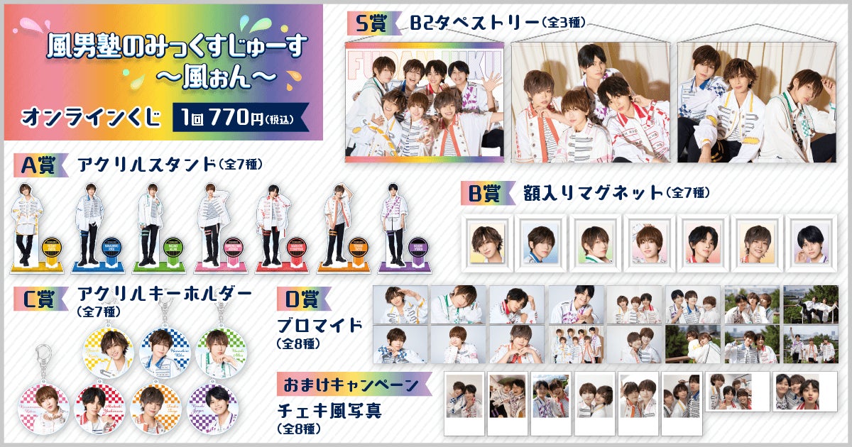 商品は、風男塾の冠番組、「風男塾のみっくすじゅーす~風ぉん~」のオリジナルグッズとなります。今回のオンラインくじのために全カット撮り下ろした写真を使用した商品や、メンバーの葉崎アランが撮影した「アラ風ォント」を使用した商品など、オリジナルグッズを多数展開しております!またボーナスチャレンジとして、オンラインくじを引いたチャンネル会員の中から抽選で10名様に「番組観覧」をプレゼント!!この機会をお見逃しなく!!
