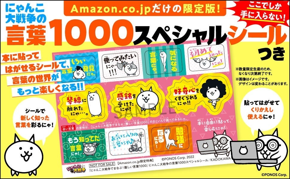 今回の発売を記念して「Amazon.co.jp限定版」を数量限定で発売。限定版は『にゃんこ大戦争の言葉1000スペシャルシール』がセットでついてくる仕様。書籍に貼ってはがせるシールは、学習のモチベーションアップになることまちがいなしのアイテムです。