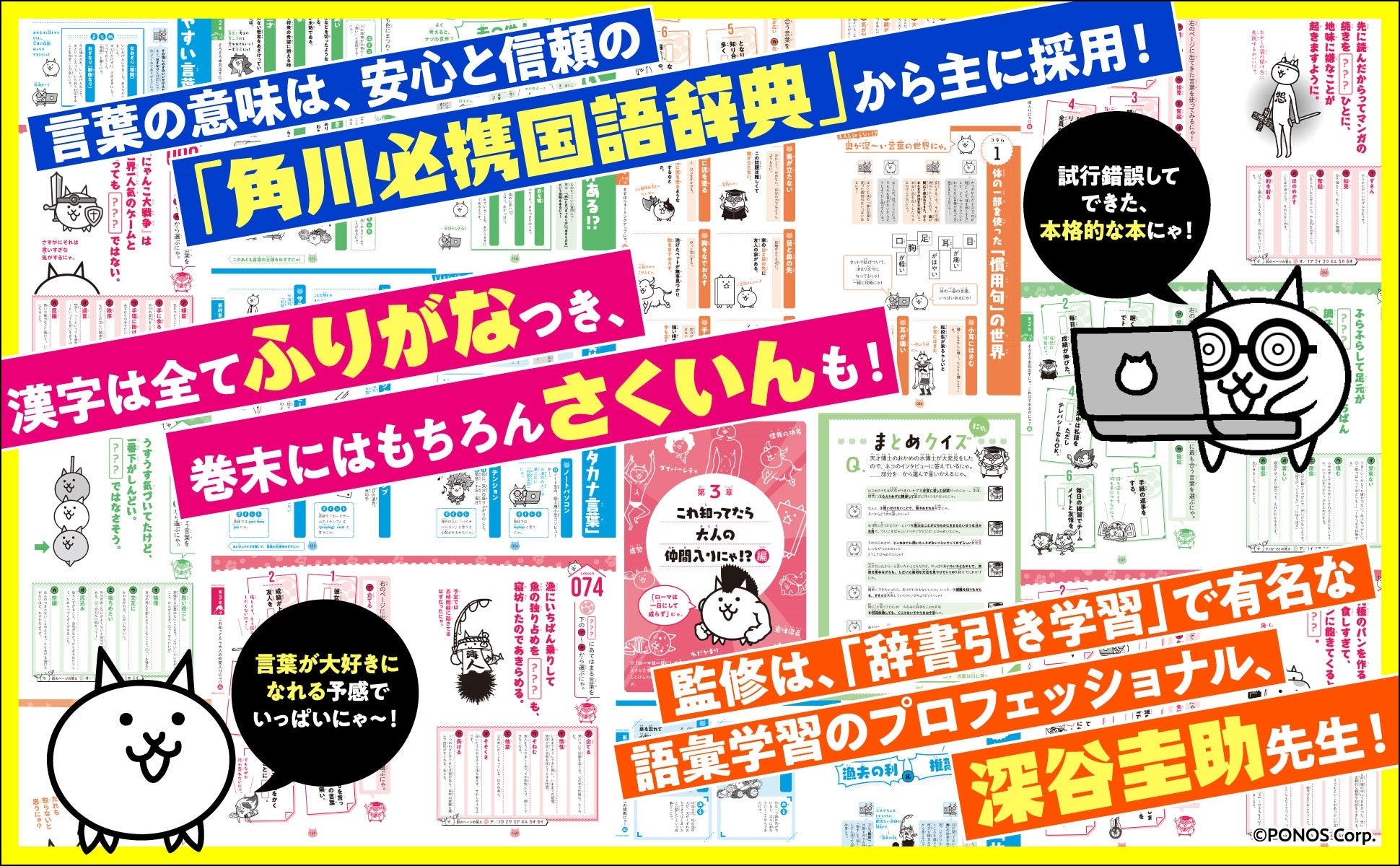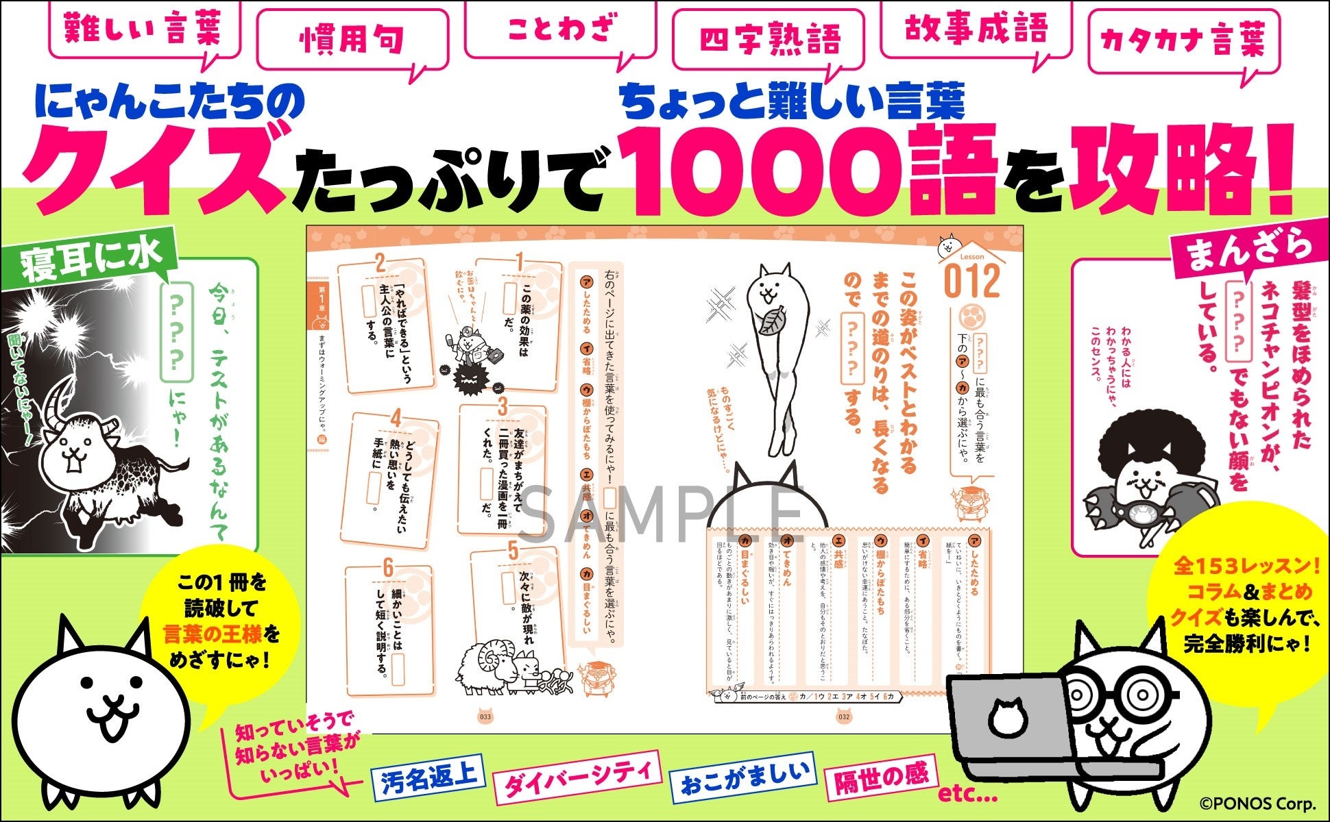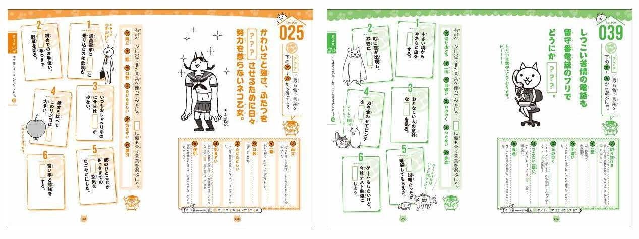 今回「にゃんこ大戦争10周年」のタイミングで新たに発売される本書は、『にゃんこ大戦争でまなぶ!』シリーズの第2弾。実生活で知っていると役に立つ「難しい言葉1000語」を学べる学習参考書です。