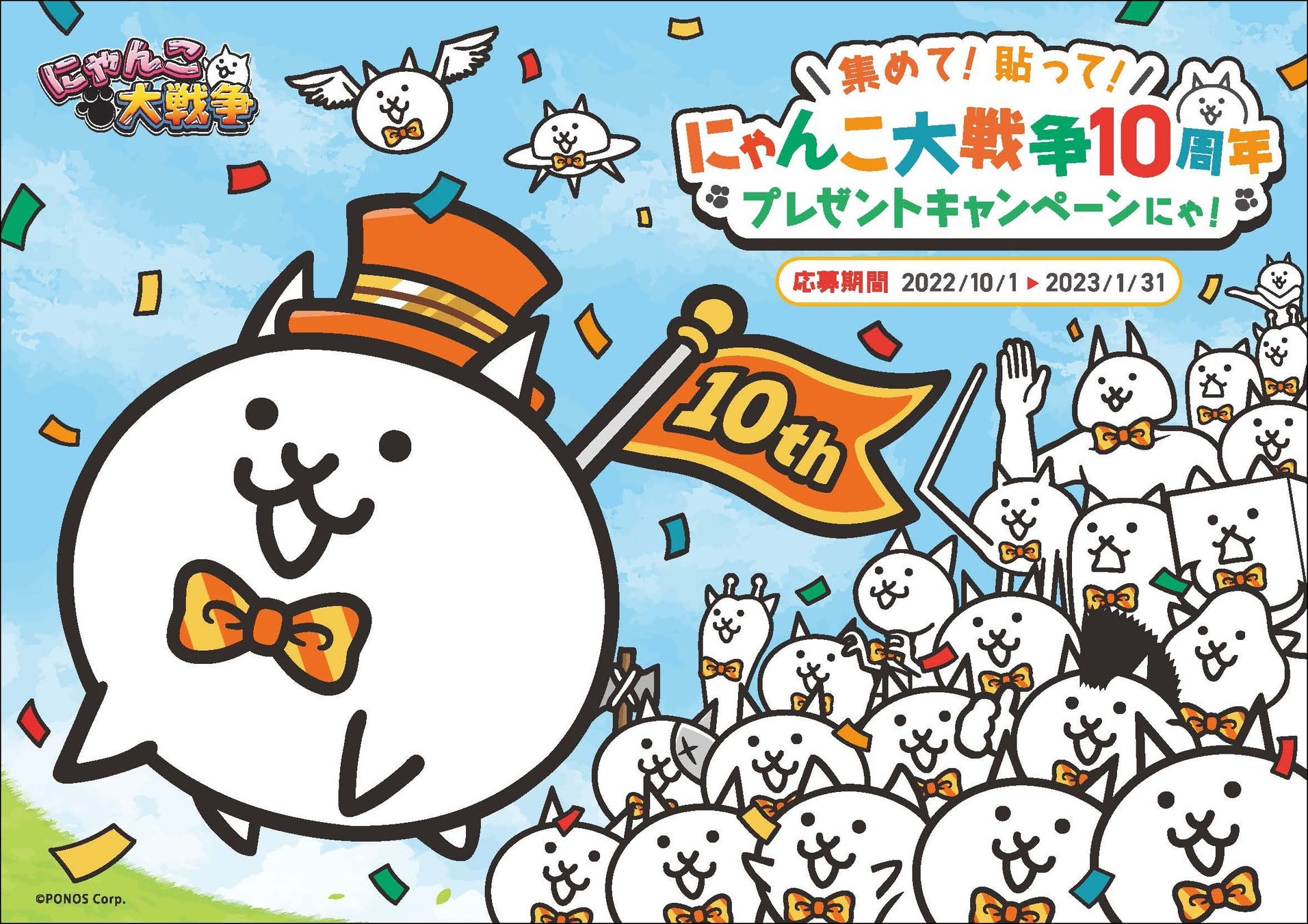 「集めて!貼って!にゃんこ大戦争10周年プレゼントキャンペーンにゃ!」はポノス株式会社が主催しています。くわしくは、以下のキャンペーンサイトをご確認ください。