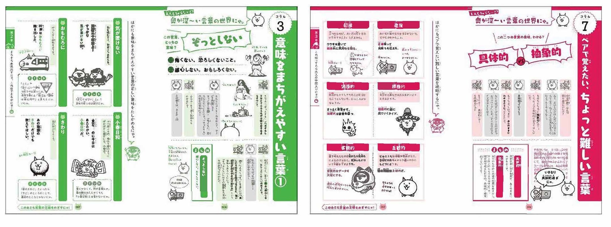 キモかわにゃんこたちと「難しい言葉1000語」をどんどん攻略していける内容で、大人になっても一生役に立つ語彙力・読解力・表現力が身につく1冊です。