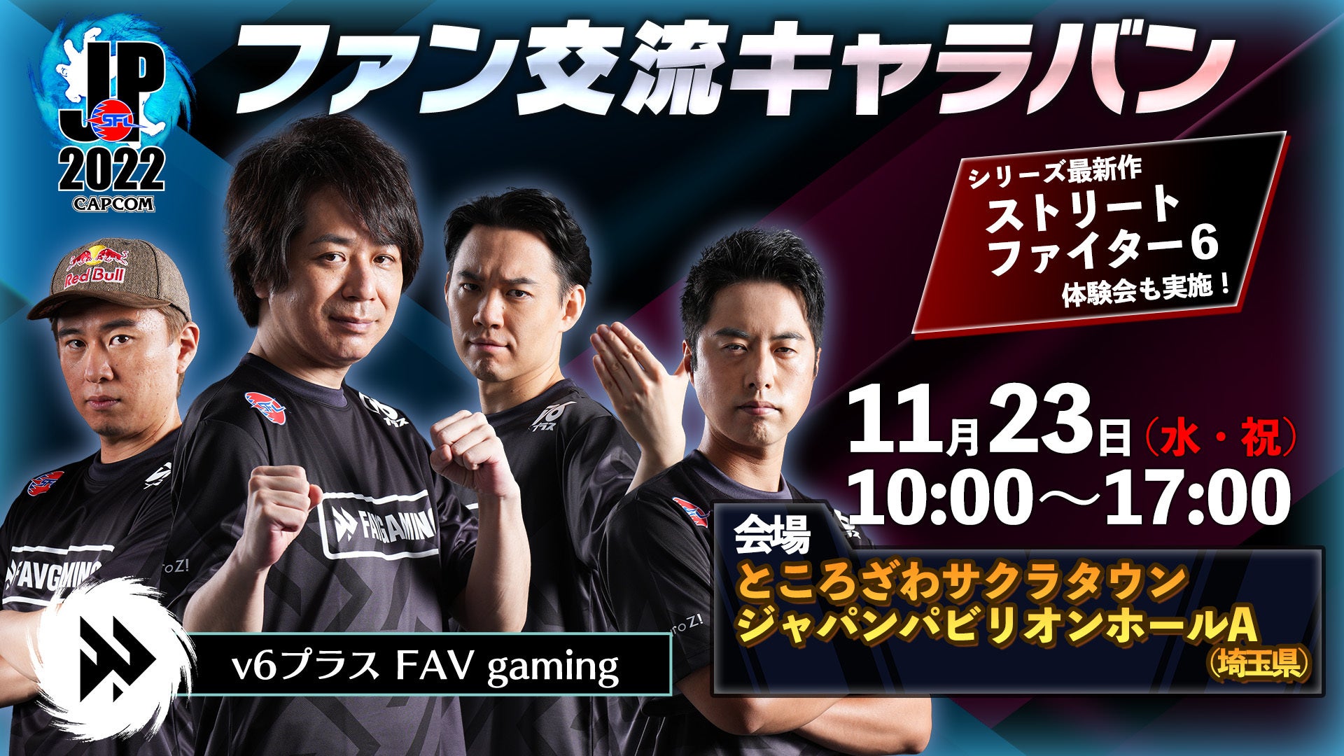 カプコンが全国で展開している「ファン交流イベント」が、ところざわサクラタウンに登場。前リーグ優勝メンバーなどで構成された「v6プラス FAV gaming」所属選手(sako選手、ときど選手、ボンちゃん選手、鶏めし選手)をゲストに迎え、トークショー、プロレクチャー、選手に挑戦できる参加型企画など、トップクラスの選手たちと身近に交流できるスペシャルイベントです。