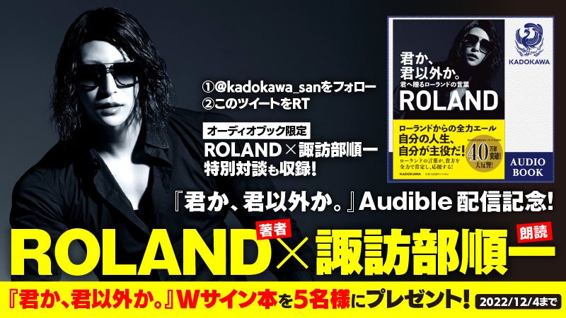 株式会社KADOKAWA(本社:東京都千代⽥区、代表取締役社⻑:夏野 剛)発⾏、ROLAND・著×諏訪部順一・朗読のオーディオブック『君か、君以外か。君へ贈るローランドの⾔葉【ROLAND×諏訪部順⼀ 特別対談付】』がAudibleで大好評配信中です。配信を記念して、プレゼントキャンペーンを実施いたします!