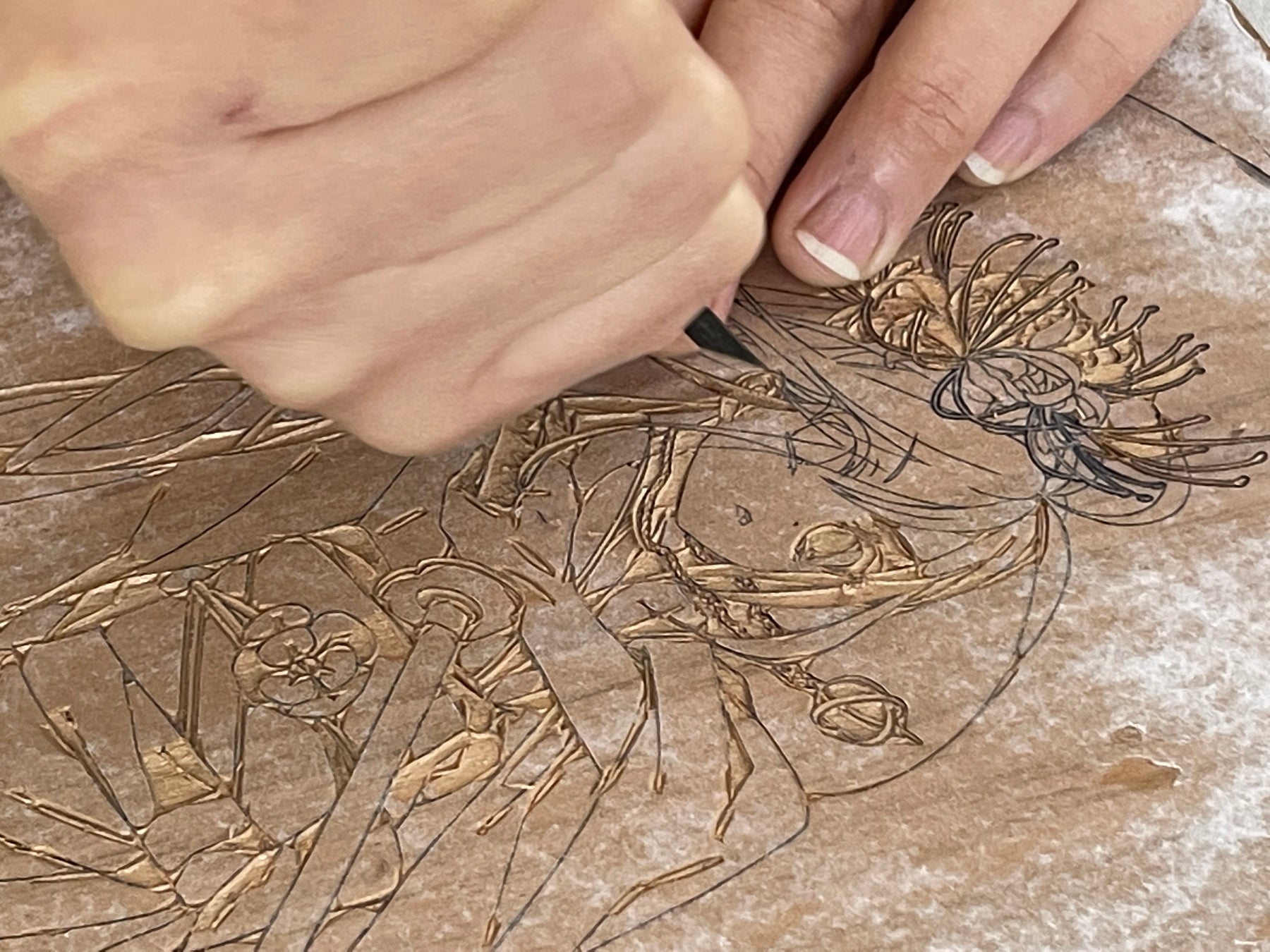 浮世絵製作の彫りは、その功績が認められ国から褒章を受けた伝統工芸士、永井 沙絵子氏が手掛け、摺りは浮世絵木版画彫摺技術保存協会副理事、現京都支部長である摺師の中山 誠人氏が手掛けており、浮世絵製作の工程のすべてが手作業で伝統技法が随所にちりばめられています。
