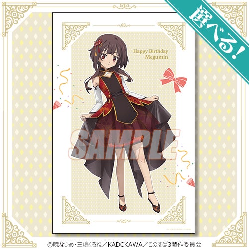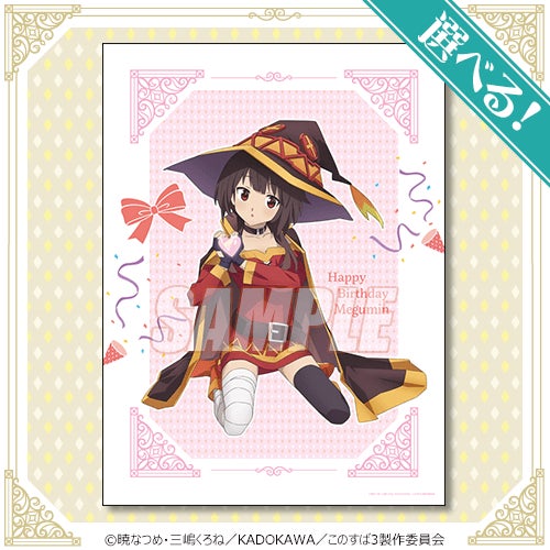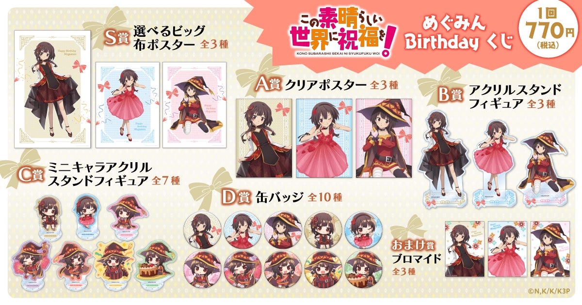商品はめぐみんの誕生日を記念した、アニメ新規描き下ろしイラストによるオリジナルグッズとなります。めぐみんの華やかな魅力を描いたイラストの商品や、可愛いミニキャラの商品など、めぐみんの魅力を詰め込んだ商品と共に、是非めぐみんの誕生日を祝いましょう! また期間中に“リツイートキャンペーン”として、くじ引き堂のTwitter公式アカウントをフォロー&リツイートすると、抽選で3名様に「B賞 アクリルスタンドフィギュアセット」をプレゼント!! この機会をお見逃しなく!!
