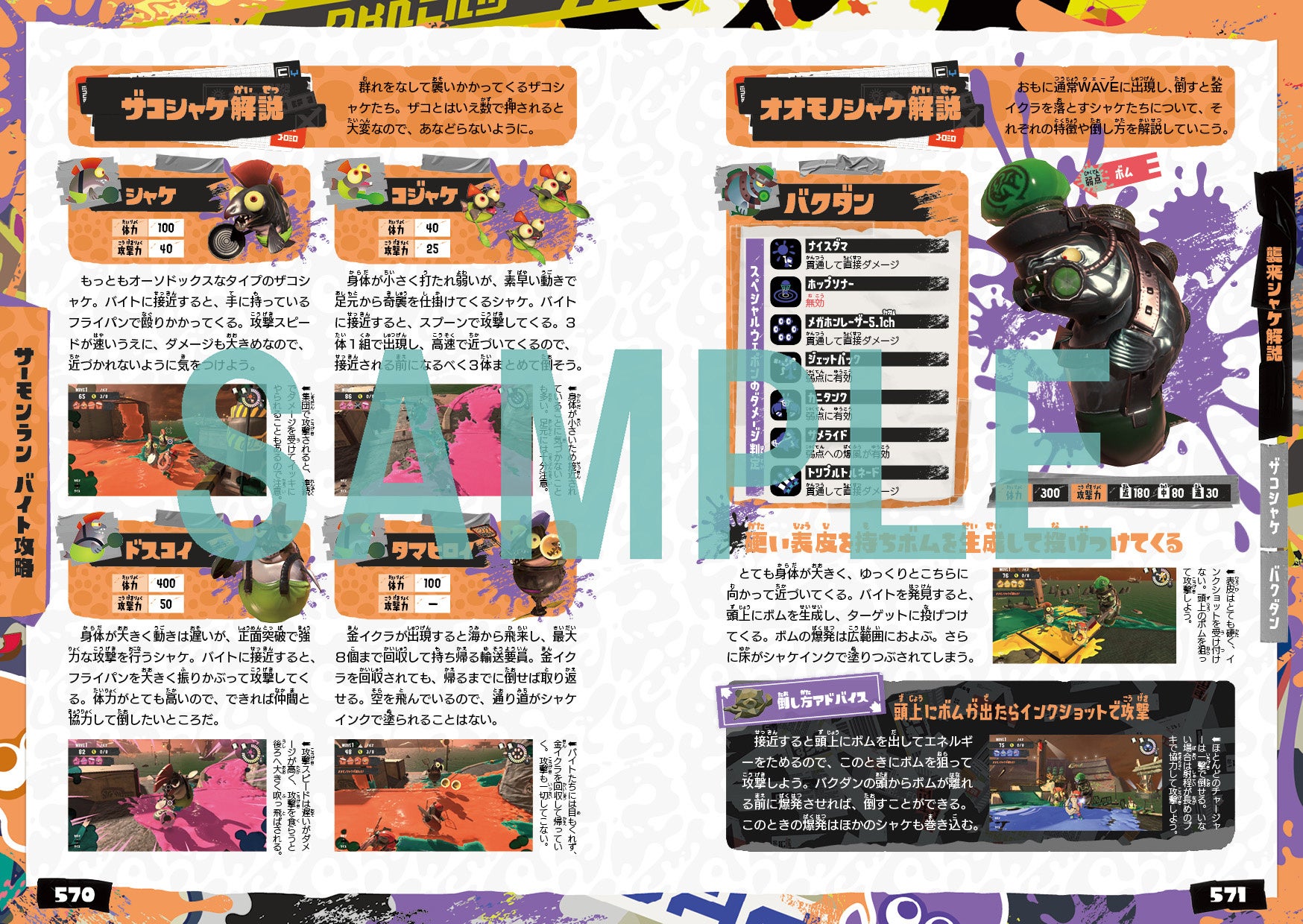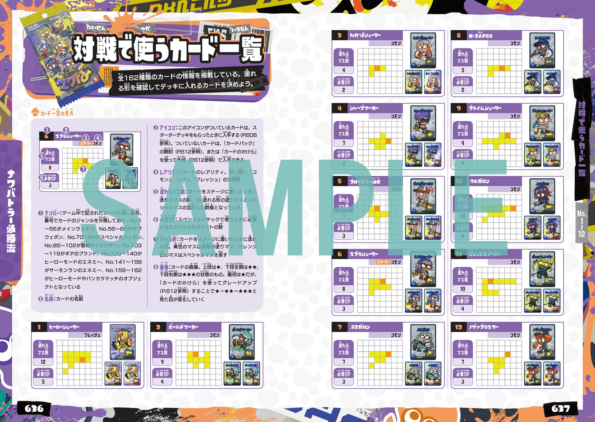 初めて『スプラトゥーン』シリーズをプレイするビギナーの方には“プレイの手引き”として、さらに “全ルール&全ステージでの立ち回り”や“すべてのブキ&ギアの性能データや活用法”など、『スプラトゥーン』シリーズをプレイし続けてきたユーザーが気になる情報も満載で”勝つためのデータベ-ス”としても役立つ攻略本になっています。