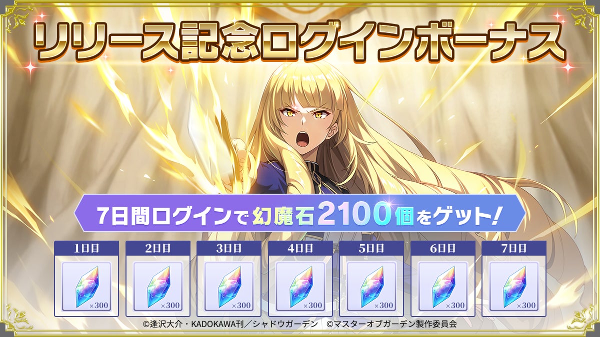 また、事前登録30万人突破に伴い、事前登録報酬である、無料ガチャ10連分以上の幻魔石(ゲーム内通貨)を配布中です。幻魔石はログインボーナスと合わせてガチャ20連分以上を配布しており、初心者ミッションクリアで「SSローズ・オリアナ(CV:白石晴香)」を配布中です。