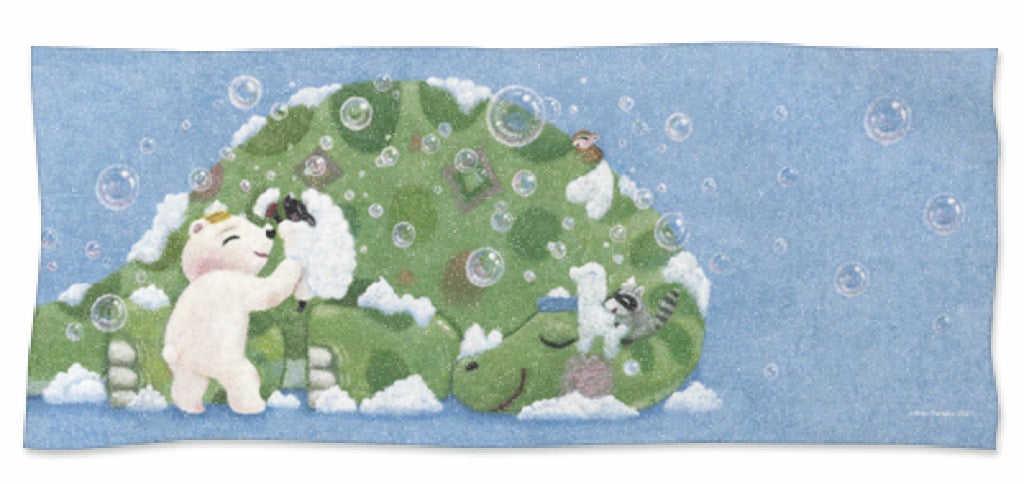 本作は、海の砂で描かれた愛らしい動物たちが、一緒におふろに入る様子を描いた絵本です。