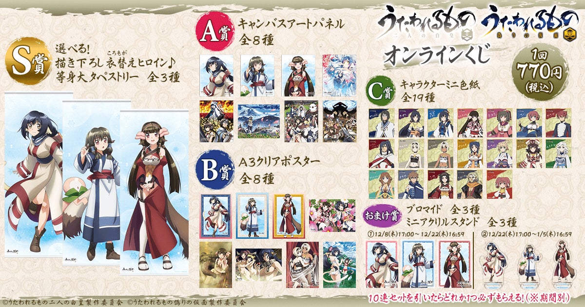 商品はアニメ2作品の完結を記念した、新規描き下ろしイラストをはじめとするオリジナルグッズとなります。普段見ることのできない着せ替え姿の描き下ろしイラスト商品や、作品の美麗なビジュアルを用いた商品など、オリジナルグッズを多数展開しております! また期間中に“リツイートキャンペーン”として、くじ引き堂のTwitter公式アカウントをフォロー&リツイートすると、抽選で2名様に「キャラクターミニ色紙セット」をプレゼント!! この機会をお見逃しなく!!