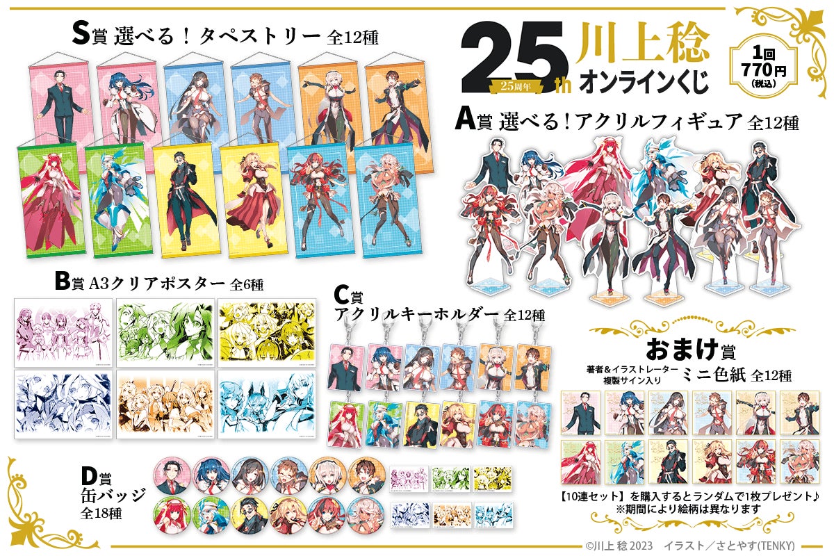 賞品はこれまで長らくタッグを組んできたイラストレーター・さとやす(TENKY)氏が周年を記念して描き下ろしたイラストを使用したオリジナルグッズとなります。「川上ワールド」と呼ばれる各シリーズの主要キャラクターたちが勢揃いした豪華なイラストのグッズ化となりますので、この機会をお見逃しなく!! また、期間中に“リツイートキャンペーン”として、くじ引き堂のTwitter公式アカウントをフォロー&リツイートすると、抽選で3名様に「D賞 缶バッジ全18種セット」をプレゼント!!