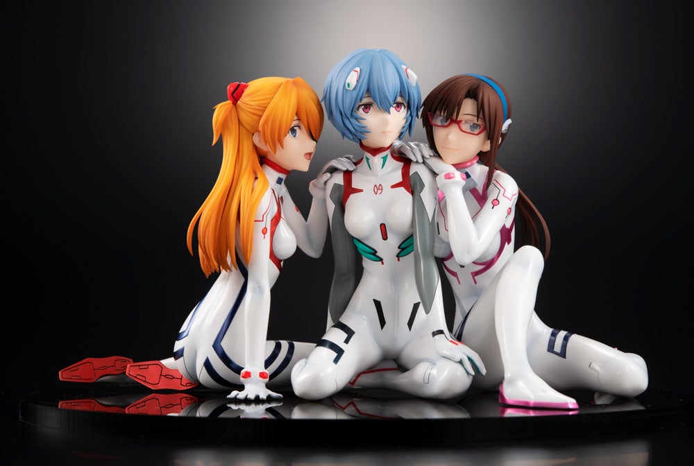 劇中で印象的な白いプラグスーツに身を包み仲良く微笑む3人娘をメリハリのある造形と彩色で表現。可憐な3人娘をぜひお手元にお迎えください。