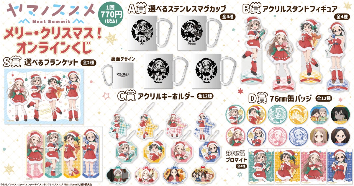 商品は、4人がサンタクロースのコスチュームを着てプレゼントを持っている新規描き下ろしイラストによるオリジナルグッズとなります。触り心地の良いブランケットや、外でも使用できるステンレスマグカップ、デスクなどに飾れるアクリルスタンドフィギュアなど、くじ引き堂でしか手に入らないオリジナルグッズを多数展開しております! また期間中に“リツイートキャンペーン”として、くじ引き堂のTwitter公式アカウントをフォロー&リツイートすると、抽選で3名様に「缶バッジセット」をプレゼント!! この機会をお見逃しなく!!