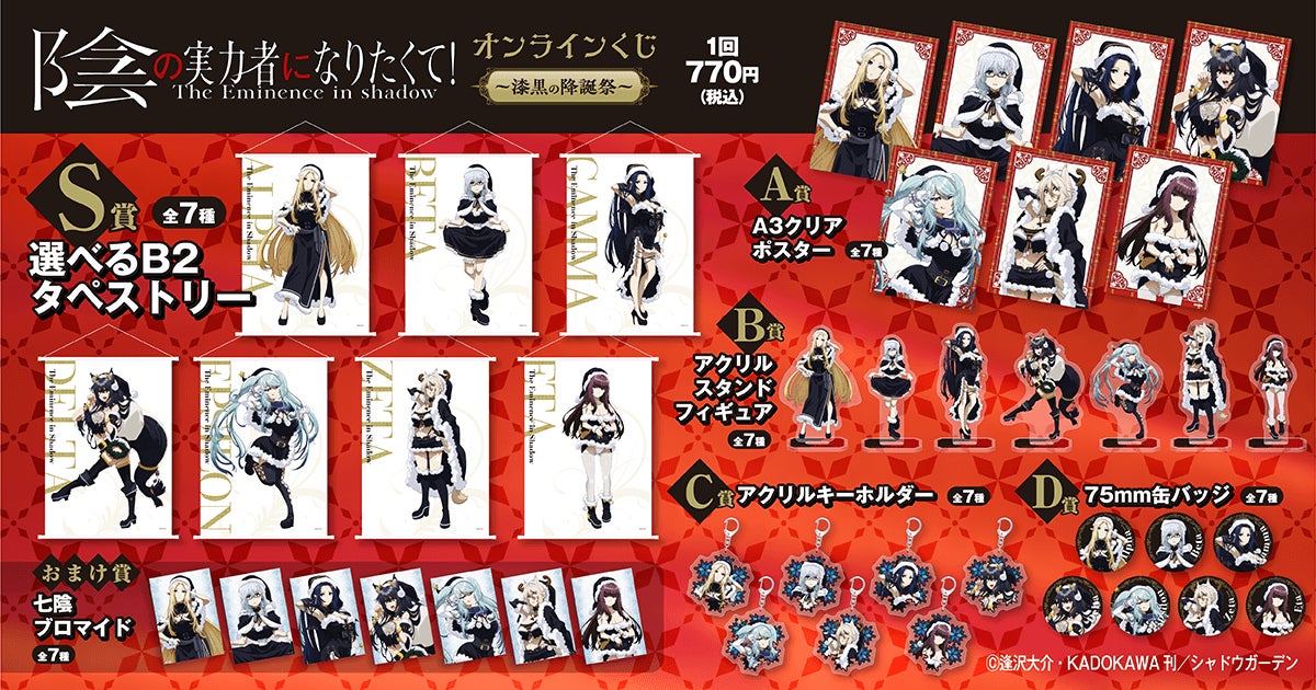 主人公シドに絶対の忠誠を誓う、シャドウガーデンの美しき精鋭たち「七陰」。今回は彼女たちがセクシーなブラックサンタ衣装に身を包んだ描き下ろしイラストによる、オリジナルグッズを多数ご用意しました。クリスマスシーズンにぴったりな、ここでしか手に入らないアイテム揃いとなっています。 また期間中に〈リツイートキャンペーン〉として、くじ引き堂のTwitter公式アカウントをフォロー&リツイートすると、抽選で3名様に缶バッジセットをプレゼント致します。この機会をお見逃しなく!