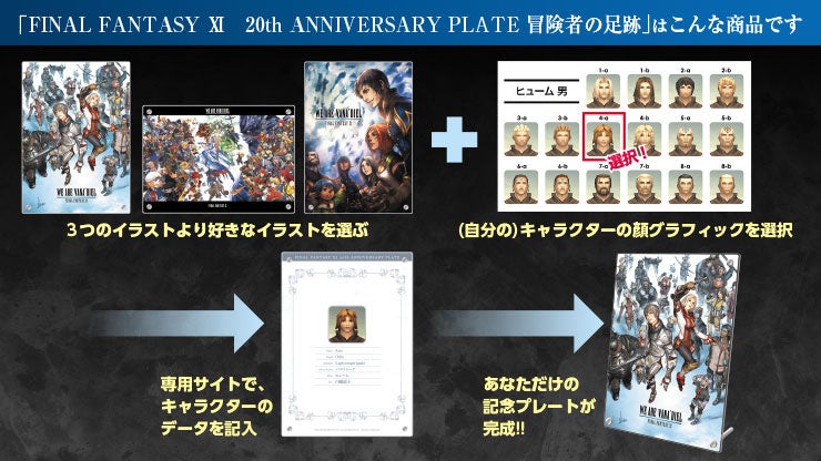 「ゲームの電撃ストア」では、『FFⅪ』の20周年を記念した以下の商品を発売。目玉となるのは「FINAL FANTASY Ⅺ 20th ANNIVERSARY PLATE 冒険者の足跡」で、3種類の好きなイラストと自分の使用キャラクターの顔グラフィックの組み合わせを選んで購入すると、専用サイトで自分のキャラクターのデータを刻むことが可能。世界で唯一のグッズを作成できます。